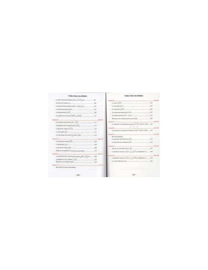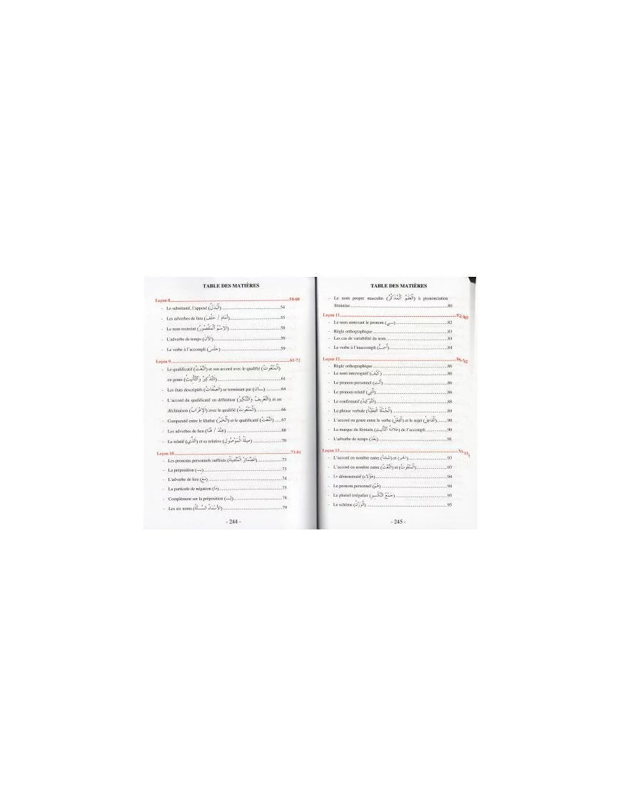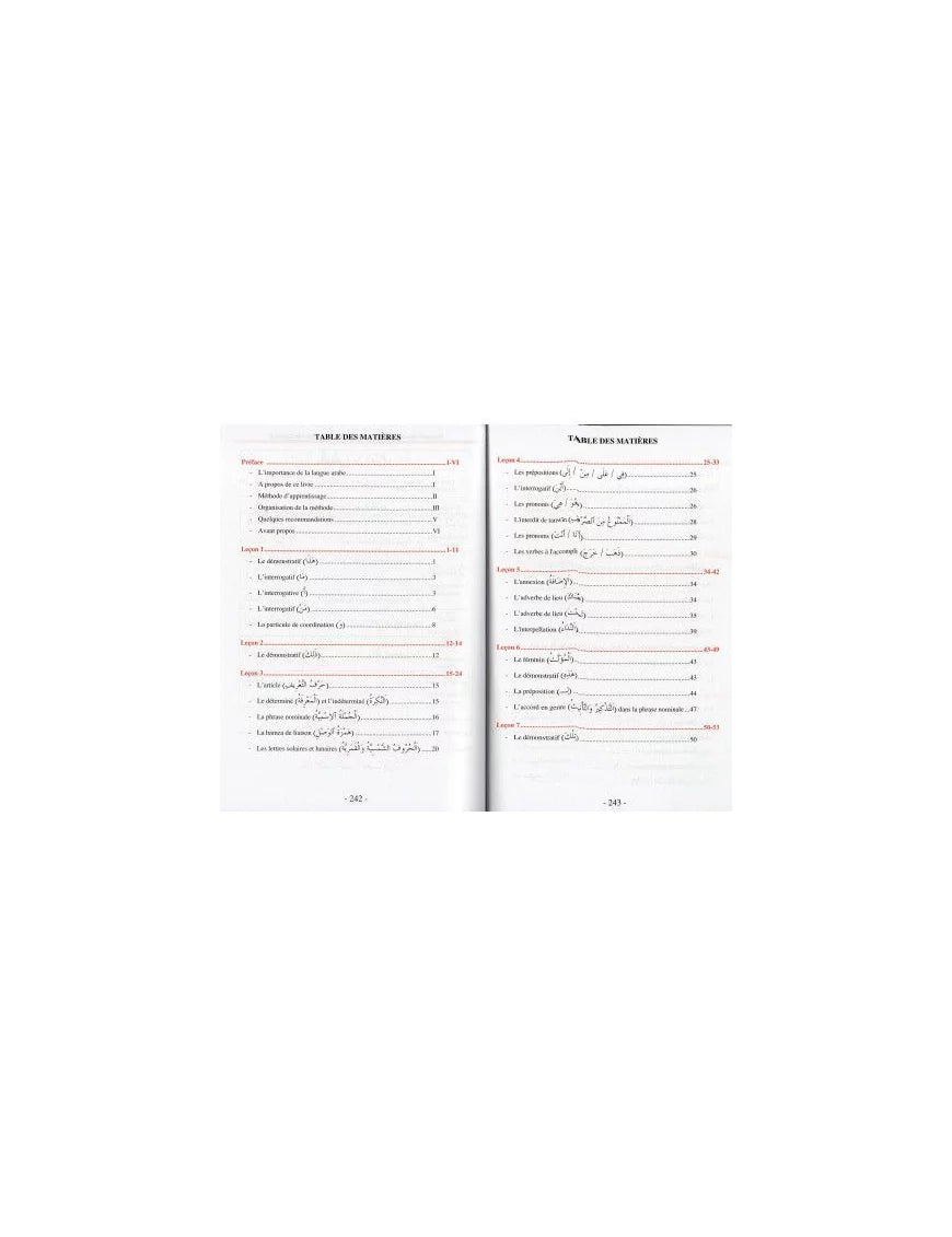 Comment ça s’utilise : Ce livre est conçu pour être étudié leçon par leçon, idéalement avec l'accompagnement d'un professeur ou en autodidacte rigoureux. L'élève lit le texte arabe, observe les nouvelles structures grammaticales, apprend le vocabulaire illustré, puis effectue les exercices d'application proposés à la fin de chaque chapitre pour valider ses acquis.